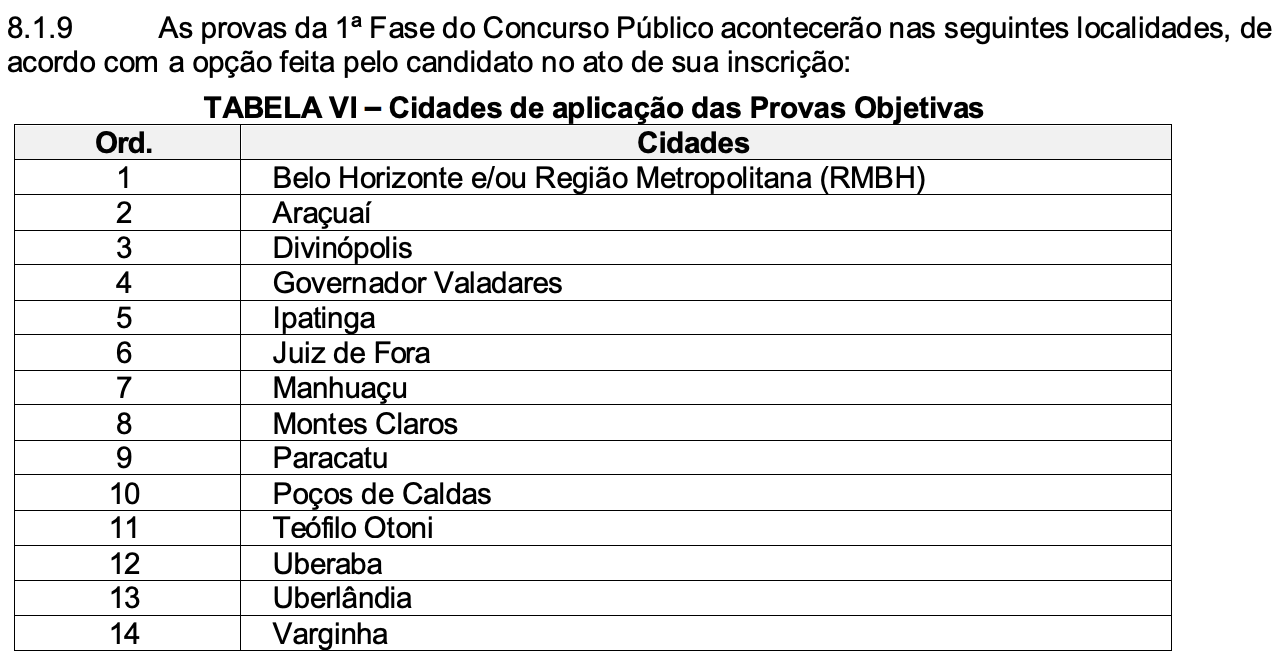As provas da primeira fase poderão ocorrer em diversas cidades de Minas Gerais, como:
